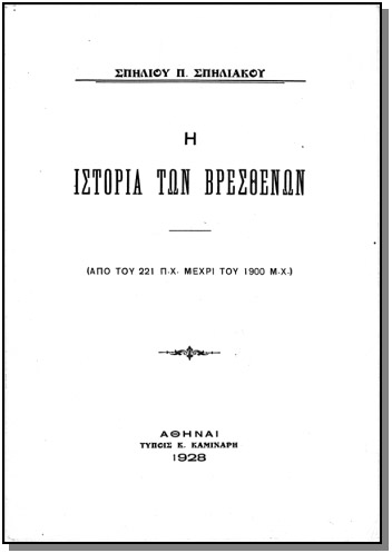 Με το παραπάνω εξώφύλλο, κυκλοφόρησε, το 1928, το βιβλίο του Σπήλιου Π. Σπηλιάκου, " Η Ιστορία των Βρεσθένων". |
