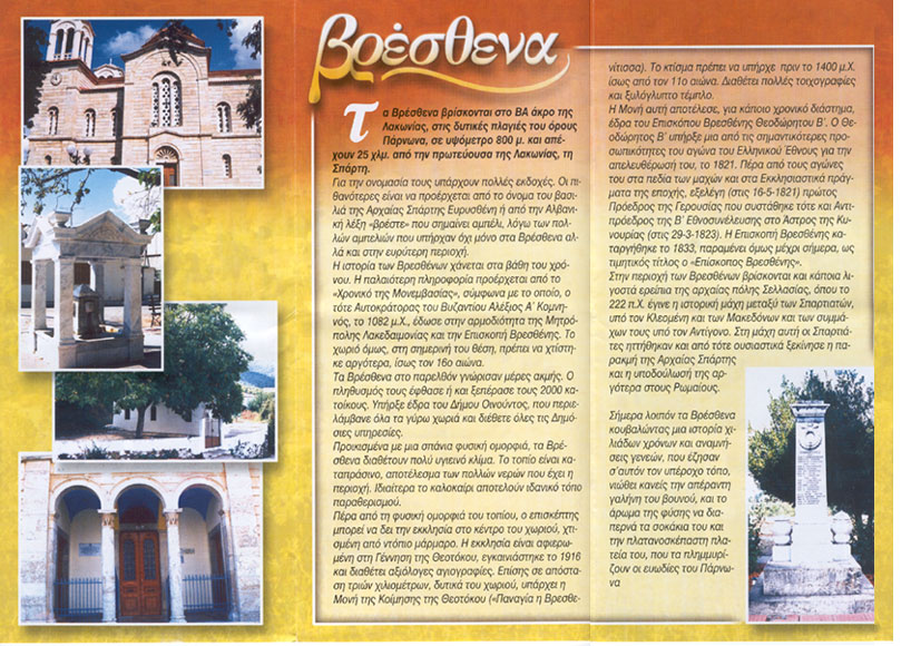 Βρέσθενα Τα Βρέσθενα βρίσκονται στο ΒΑ άκρο της Λακωνίας, στις δυτικές πλαγιές του όρους Πάρνωνα, σε υψόμετρο 800μ. και απέχουν 25χλμ. από την πρωτεύουσα της Λακωνίας, τη Σπάρτη. Για την ονομασία τους υπάρχουν πολλές εκδοχές. Οι πιθανότερες είναι να προέρχεται από το όνομα του βασιλιά της Αρχαίας Σπάρτης Ευρυσθένη ή από την Αλβανική λέξη "βρέστε" που σημαίνει αμπέλι, λόγω των πολλών αμπελιών που υπήρχαν όχι μόνο στα Βρέσθενα αλλά και στην ευρύτερη περιοχή. Η ιστορία των Βρεσθένων χάνεται στα βάθη του χρόνου. Η παλαιότερη πληροφορία προέρχεται από το "Χρονικό της Μονεμβάσιας", σύμφωνα με το οποίο, ο τότε Αυτοκράτορας του Βυζαντίου Αλέξιος Α΄ Κομνηνός, το 1082μ.Χ., έδωσε στην αρμοδιότητα της Μητρόπολης Λακεδαιμονίας και την Επιτροπή Βρεσθένης. Το χωριό όμως, στη σημερινή του θέση, πρέπει να χτίστηκε αργότερα, ίσως τον 16ο αιώνα. Τα Βρέσθενα στο παρελθόν γνώρισαν μέρες ακμής. Ο πληθυσμός τους έφθασε ή και ξεπέρασε τους 2000 κατοίκους. Υπήρξε έδρα του Δήμου Οινούντος, που περιελάμβανε όλα τα γύρω χωριά και διέθετε όλες τις Δημόσιες υπηρεσίες. Προικισμένα με μια σπάνια φυσική ομορφιά, τα Βρέσθενα διαθέτουν πολύ υγιεινό κλίμα. Το τοπίο είναι καταπράσινο, αποτέλεσμα των πολλών νερών που έχει η περιοχή. Ιδιαίτερα το καλοκαίρι αποτελούν ιδανικό τοπίο παραθερισμού. Πέρα από τη φυσική ομορφιάς του τοπίου, ο επισκέπτης μπορεί να δει την εκκλησία στο κέντρο του χωριού, χτισμένη από ντόπιο μάρμαρο. Η εκκλησία είναι αφιερωμένη στη Γέννηση της Θεοτόκου, εγκαινιάστηκε το 1916 και διαθέτει αξιόλογες αγιογραφίες. Επίσης σε απόσταση τριών χιλιομέτρων , δυτικά του χωριού, υπάρχει η Μονή της Κοίμησης της Θεοτόκου ("Παναγία η Βρεσθενίτισσα"). Το κτίσμα πρέπει να υπήρχε πριν από το 1400μ.Χ. ίσως από τον 11ο αιώνα. Διαθέτει πολλές τοιχογραφίες και ξυλόγλυπτο τέμπλο. Η Μονή αυτή αποτέλεσε, για κάποιο χρονικό διάστημα, έδρα του Επισκόπου Βρεσθένης Θεοδώρητου Β΄. Ο Θεοδώρητος Β΄ υπήρξε μια από τις σημαντικότερες προσωπικότητες του αγώνα του Ελληνικού Έθνους για την απελευθέρωσή του, το 1821. Πέρα από τους αγώνες του στα πεδία των μαχών και στα Εκκλησιαστικά πράγματα της εποχής, εξελέγη (στις 16-5-1821) πρώτος πρόεδρος της Β΄ Εθνοσυνέλευσης στο Άστρο της Κυνουρίας (στις 29-3-1823). Η Επισκοπή Βρεσθένης καταργήθηκε το 1833, παραμένει όμως μέχρι σήμερα, ως τιμητικός τίτλος ο "Επίσκοπος Βρεσθένης". Στην περιοχή των Βρεσθένων βρίσκονται και κάποια λιγοστά ερείπια της αρχαίας πόλης Σελλασίας, όπου το 222π.Χ. έγινε η ιστορική μάχη μεταξύ των Σπαρτιατών, υπό τον Κλεομένη και των Μακεδόνων και των συμμάχων τους υπό τον Αντίγονο. Στη μάχη αυτή οι Σπαρτιάτες ηττήθηκαν και από τότε ουσιαστικά ξεκίνησε η παρακμή της Αρχαίας Σπάρτης και η υποδούλωσή της αργότερα στους Ρωμαίους. Σήμερα λοιπόν τα Βρέσθενα κουβαλώντας μια ιστορία χιλιάδων χρόνων και αναμνήσεις γενεών, που έζησαν σ'αυτόν τον υπέροχο τόπο, νιώθει κανείς την απέραντη γαλήνη του βουνού, και το άρωμα της φύσης να διαπερνά τα σοκάκια του και την πλατανοσκέπαστη πλατεία του, που τα πλημμυρίζουν οι ευωδιές του Πάρνωνα. |